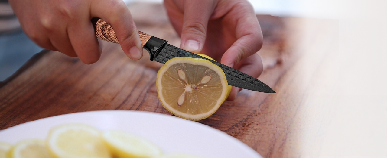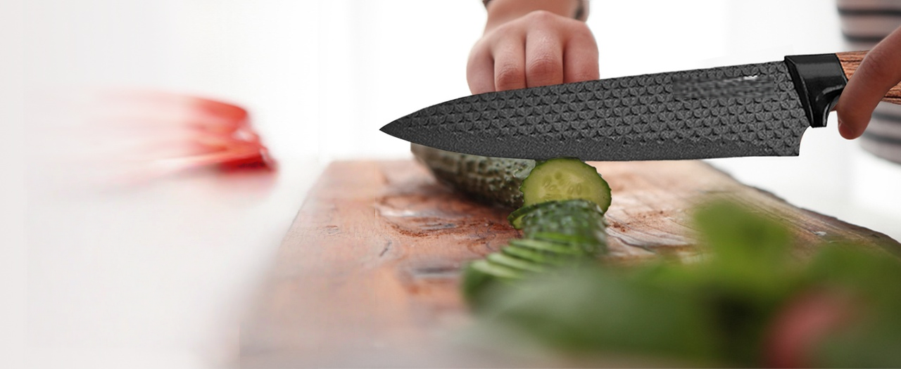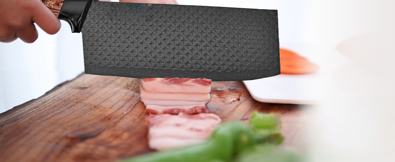 Egyedi penge kialakítás - Klasszikus 3cr13 + gyémánt penge + tapadásmentes bevonat, a speciális, új, továbbfejlesztett gyémánt mintás tapadásmentes bevonatú konyhai kések különlegesek és feltűnőek.